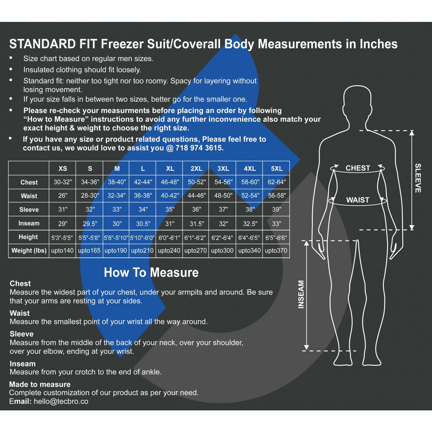 STANDARD FIT Freezer Suit/Coverall Body Measurements in Inches